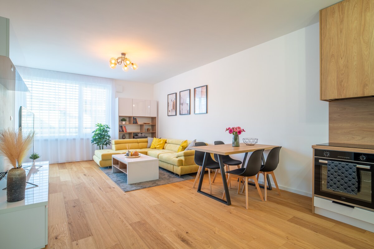 L'appartamento è ideale anche perché si trova a 10 minuti a piedi dal centro principale della città e dispone di uno studio, perché separa le stanze con le porte. Appartamento di 3 camere da 64 m², cucina (3x3,5), soggiorno con un letto (6,5x3,5), camera con un letto grande (3,5x3,5), WC separato, ristoranti e negozi a 5 minuti a piedi dall'appartamento. Parcheggio gratuito. Possibilità di offerta per il trasferimento da. Aeroporto di Bratislava o Vienna