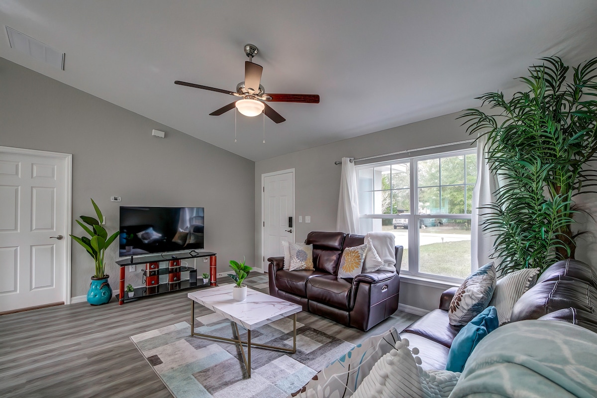 Ti diamo il benvenuto nella tua vacanza tranquilla! Questo incantevole rifugio di Bushnell unisce la vita di campagna al comfort moderno. Il cottage offre camere da letto accoglienti e una cucina completa per preparare pasti casalinghi. Rilassati all'aperto sotto il cielo stellato o esplora la vicina Foresta di Withlacoochee, The Villages, Orlando e Tampa. A pochi minuti dalla I-75, è il luogo perfetto per famiglie, coppie o gruppi che cercano una vacanza tranquilla con facile accesso alle migliori attrazioni della Florida centrale.