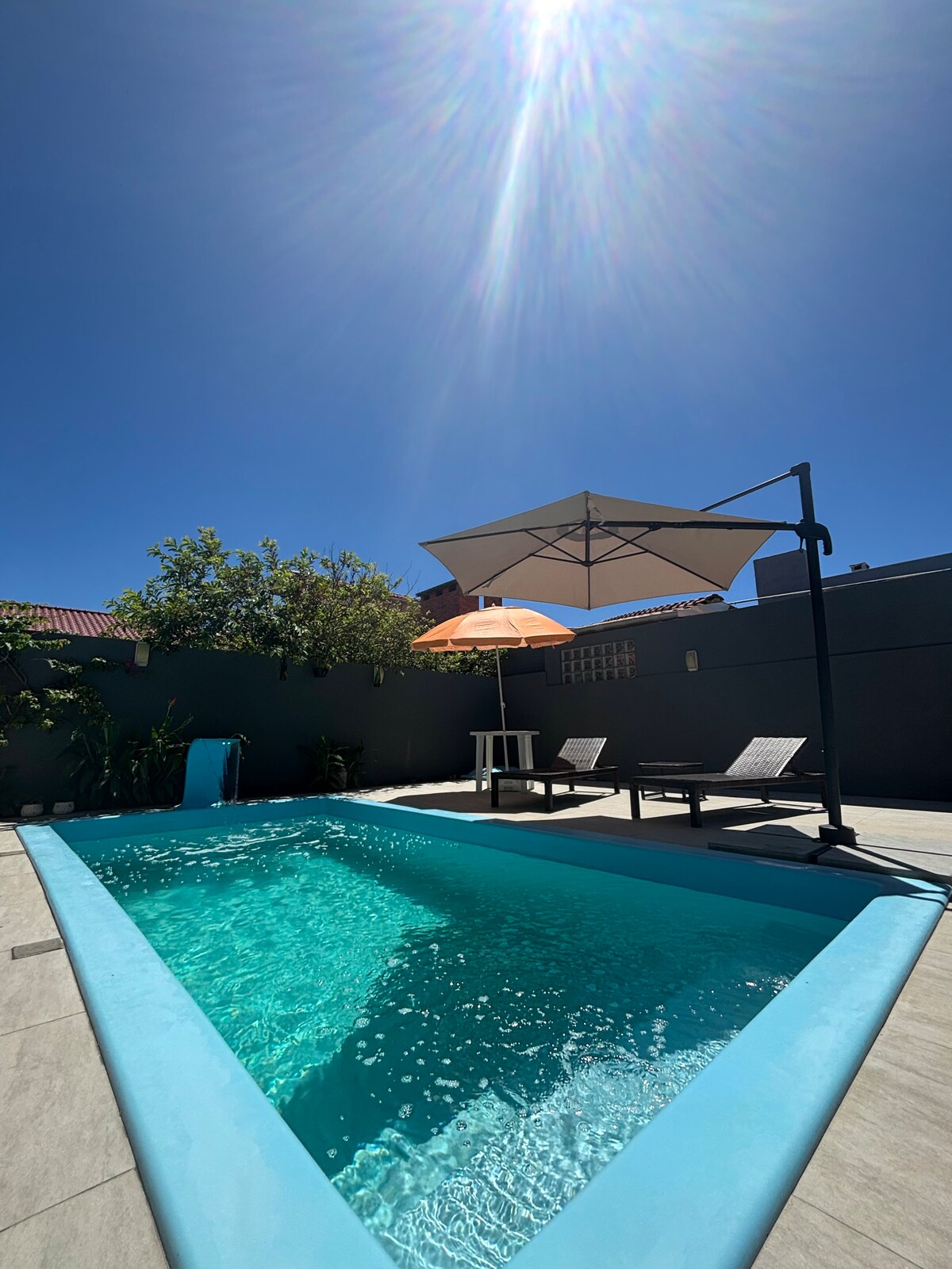 Casa confortevole a Noiva do Mar/Xangri-lá, ventilata, letti comodi, piscina con pannelli solari, allarme monitorato, smart TV da 50", Wi-Fi, lavatrice, asciugacapelli. Arredi e utensili nuovi. Ideale per il riposo e l'integrazione. Vicino a tutto, a 150 metri dalla spiaggia. Orari di check-in e check-out flessibili. La prima suite ha un letto matrimoniale e aria condizionata, la seconda suite ha due letti singoli e aria condizionata, e la terza camera da letto è di 7 m2 e ha un letto matrimoniale retrattile e una scrivania, con un ventilatore.