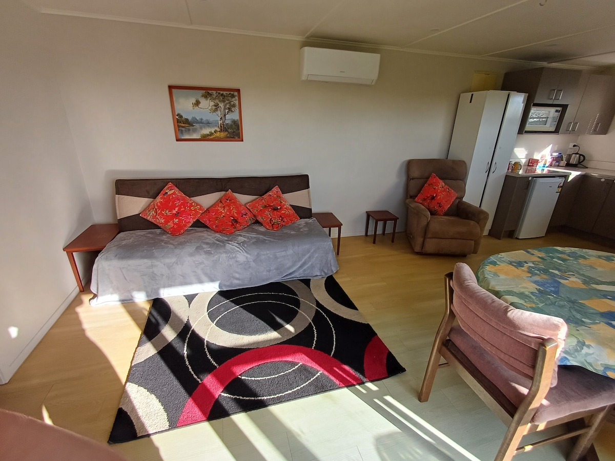Guest room separate to the main house. Its a large studio room with en-suite. We're out in the country on a large lifestyle block, only 5mins from Inglewood which is a great little town, and 20mins from New Plymouth. Its a peaceful spot with a great view of Mt Taranaki from our garden. Our place is shared with 2 dogs (outside dogs), 3 cats (probably wouldn't see them), chickens and cattle on the farm From Sept - Oct we have lambs that are being hand fed. :-)