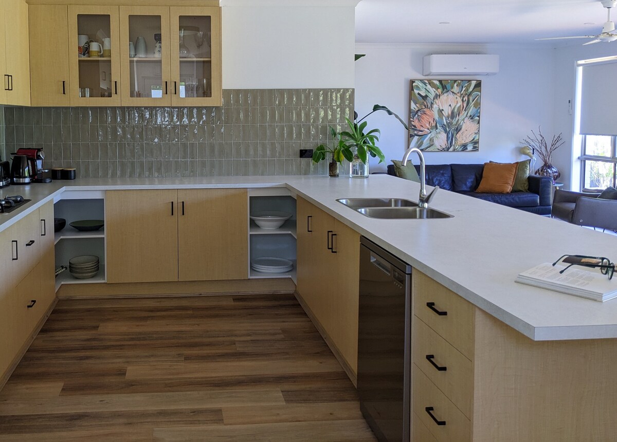 Questa villa sulla spiaggia con 3 camere da letto, arredata con gusto, è la più ben posizionata a South Shores, proprio accanto al lungomare che porta alla spiaggia, a un parco pittoresco e a due piscine, ma con privacy e una vista mozzafiato sui terreni punteggiati di canguri fino alle dune di sabbia. La luminosa zona giorno offre pace e tranquillità sia all'interno che all'esterno, con i vantaggi in stile resort a pochi passi di distanza.