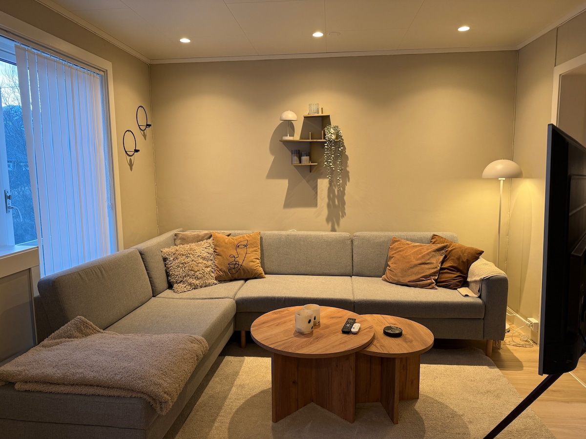 Accogliente appartamento su due piani in un ambiente tranquillo a due passi dal mare. 10 minuti a piedi dal centro città e 5 minuti a piedi dal negozio di alimentari più vicino. L'appartamento dispone di un proprio parcheggio esterno al garage, ha due spaziose camere da letto con buoni letti e terrazzo con vista unica sul fiordo.