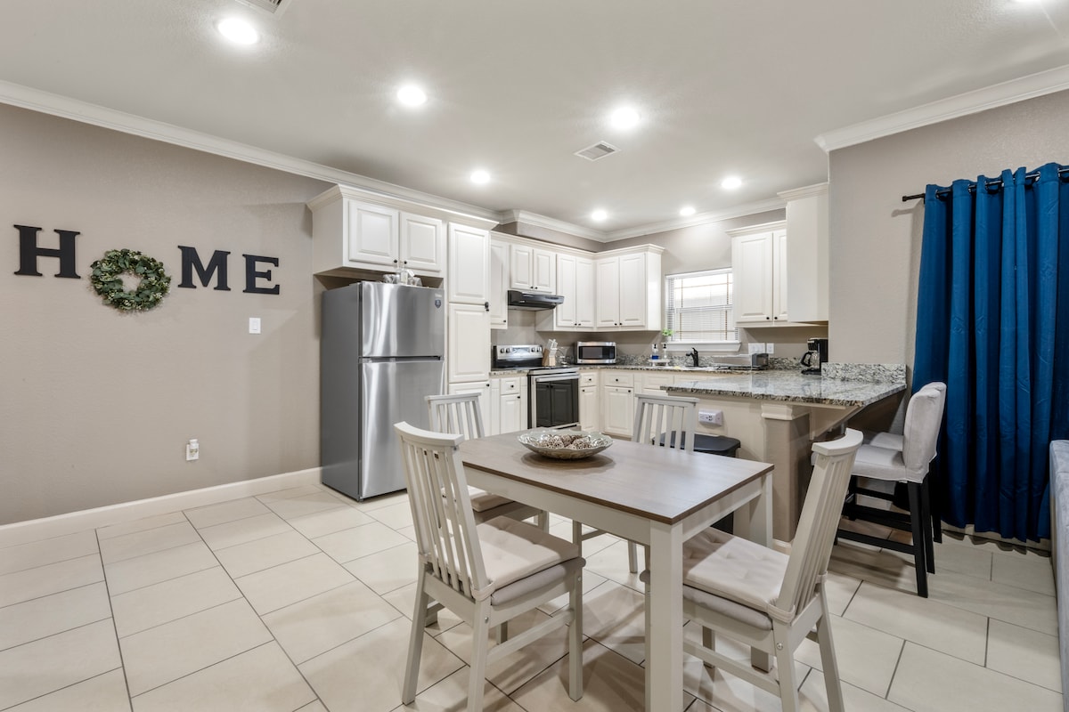 Moderno appartamento con garage indipendente completamente ristrutturato in un monolocale privato con ingresso indipendente. Situato nel centro di Houston, perfetto per coppie o viaggiatori singoli. Goditi la tua vasca idromassaggio privata dopo una giornata trascorsa alla scoperta della città. Dispone di un comodo letto king size, cucina completamente attrezzata, Smart TV e WiFi veloce. Spazio elegante, accogliente e tranquillo progettato per il relax e la comodità. Perfetto per fughe romantiche o soggiorni di lavoro.