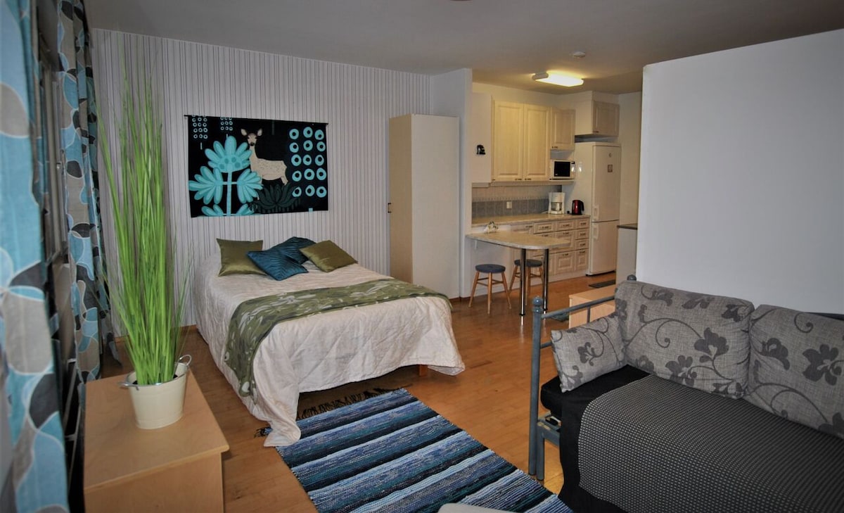 Situato nel centro di Joensuu, in un tranquillo condominio un monolocale luminoso e grazioso: - Letto matrimoniale divisibile in due letti separati - Posto auto in cortile e un punto di presa per auto per il riscaldamento dell'auto - Climatizzatore - Lavatrice - Un ampio armadio per i vestiti e i bagagli - Un piccolo bagno con doccia L'appartamento è situato a breve distanza a piedi dal centro città. La distanza a piedi dalla stazione ferroviaria è di circa 15 minuti e dall'Università.