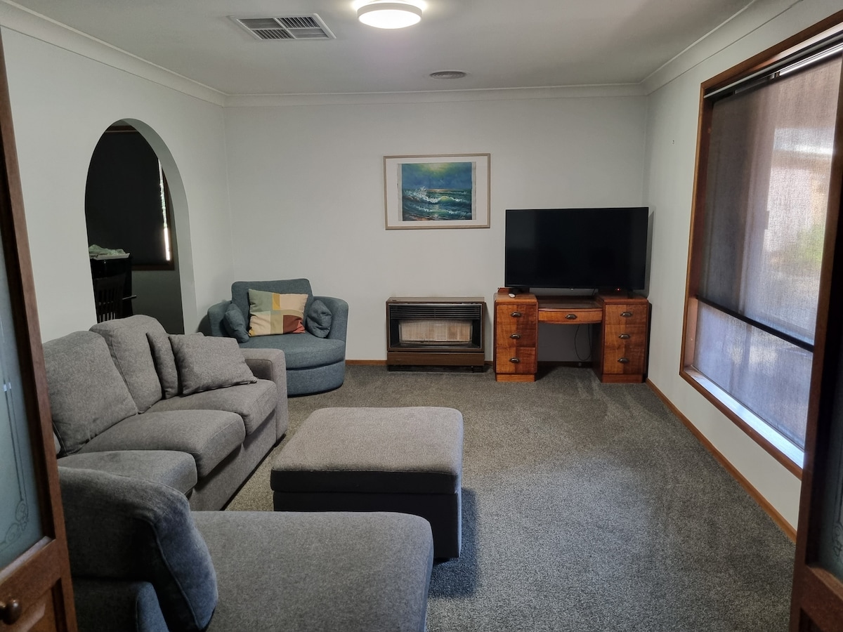 This lovely 3 bedroom home has been recently renovated and is fully furnished. For your comfort we provide bedding, a coffee machine, free hi-speed wi-fi and Bluetooth speaker. The house has a fully fenced back yard and is pet friendly. The study has a second TV and couch, great for kids viewing. The house has a large covered veranda around 3 sides of the house. The back veranda has seating and a BBQ, the front has comfy outdoor furniture and overlooks the country hills.