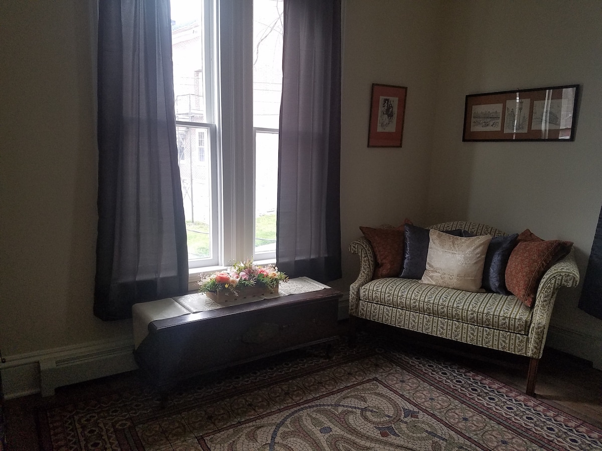 Questo è il secondo appartamento ristrutturato sopra il negozio di antiquariato sulla graziosa Greenwich Street storica. Questo appartamento è il lato "più luminoso" dell'edificio con più illuminazione naturale delle finestre. Ha anche una cucina di dimensioni normali piena di utensili da cucina per tutte le esigenze culinarie e più spazio per sedersi in cucina, nonché un bagno leggermente più grande. C'è un forno a microonde, una grande caffettiera, un frullatore, ecc. C'è una scrivania e una TV nel soggiorno e nella camera da letto. Nessun bambino sotto i 16 anni.