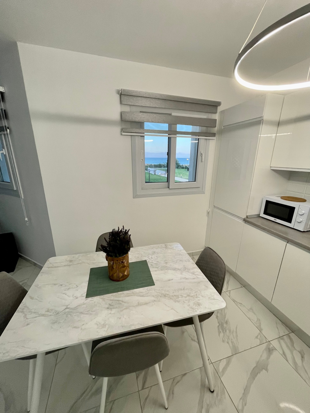 Appartamento ha 60 mq e si estende a 16 mq ampio balcone dove ci si può rilassare e godere di grandi viste sul mare Mediterraneo; ha 1 camere da letto e 1 bagno ed è completamente attrezzata con tutti gli elementi essenziali. La meravigliosa spiaggia di Thalassa si trova a pochi minuti a piedi dall'appartamento. Accogliente ristorante "Deks" così come Mini-market, grande piscina esterna, piscina interna riscaldata, grande Spa-center e palestra disponibili in loco. Gli aeroporti di Larnaca ed Ercan sono raggiungibili in 1.10 ore di auto.