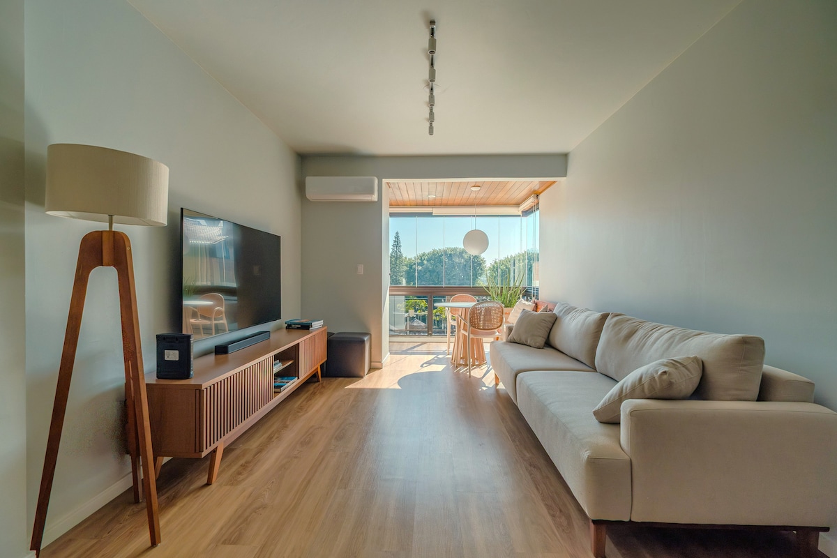 Imóvel totalmente renovado e moderno, a apenas 2 minutos da praia a pé. Possui suíte com cama queen, segundo quarto com cama de casal e uma de solteiro, ar-condicionado em todos os ambientes e espaço home office com internet de alta velocidade (600 MB). Duas Smart TVs 4K, TV a cabo com 240 canais, cozinha completa com cafeteiras, lava e seca Samsung e soundbar JBL. Sacada integrada com churrasqueira a carvão e vista para a piscina do condomínio.
