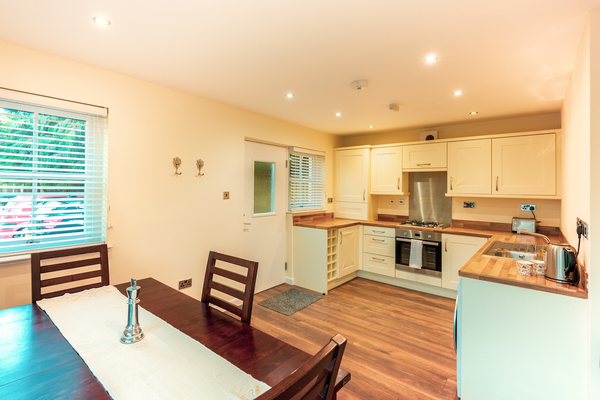 Situated in a quiet cul-de-sac, the property has recently been refurbished and is light, bright and welcoming.Accessed by two steps,internally the house is all on one level, with a deck leading out from the living room to the front, which faces west giving views of wonderful skies and sunsets. Guests are welcome to use any of the herbs growing in the enclosed rear garden. Although bordered by a road at the rear, any slight noise from the light traffic is muffled by a fence and trees.