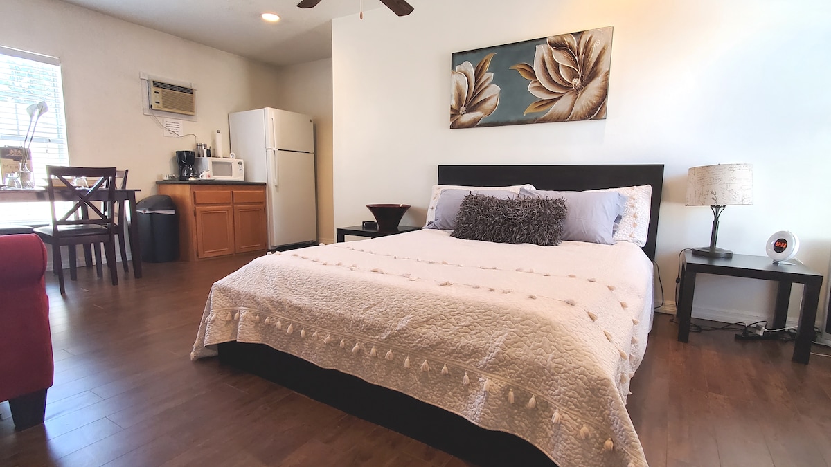 MINI-STUDIO PRIVATO CON: • Ingresso PRIVATO • Parcheggio esterno GRATUITO PRIVATO • Patio PRIVATO (È CONSENTITO FUMARE solo all'aperto, nel patio) • Angolo cottura PRIVATO • Bagno PRIVATO • Letto matrimoniale e divano letto singolo: avvisa IN ANTICIPO se avrai bisogno del DIVANO LETTO per il tuo soggiorno • Piccolo frigorifero e TV a schermo piatto con HBO • Posti letto per massimo due adulti. Più adatto per un singolo occupante, una coppia o due amici intimi. (NON siamo autorizzati ad accogliere più di due ospiti.)