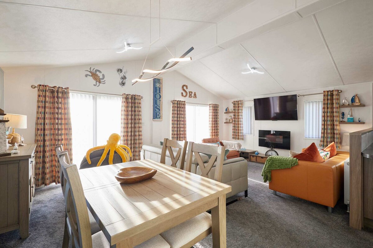 Goditi un po' di lusso in questo Pemberton Rivendale Lodge di alta gamma. Questo grande lodge di 6 x 12 metri (le dimensioni di due roulotte) si trova sul lungolago e dispone di un'enorme terrazza panoramica rivolta a sud, la più grande del parco. Completa di mobili da giardino in rattan, per goderti comodamente il sole tutto il giorno. Questo lodge ha interni di alta qualità, completo di una cucina completamente attrezzata con frigorifero con congelatore in stile americano, lavastoviglie di grandi dimensioni e lavasciuga.