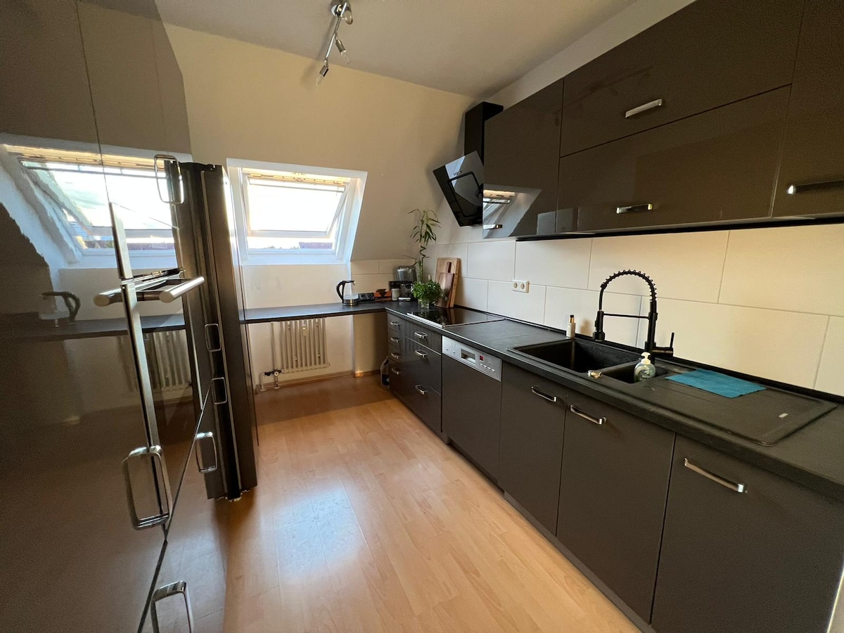 Spaziosa maisonette a due piani a Nürnberg Langwasser, situata proprio di fronte alla metropolitana. Il centro espositivo dista 12 minuti a piedi. Il centro città è a soli 12 minuti di distanza. Due balconi, una grande terrazza e una più piccola, offrono spazio per rilassarsi. Supermercati, bar e negozi sono raggiungibili in pochi minuti a piedi. La piscina pubblica con sauna e il Südklinikum sono a soli 5 minuti con i mezzi pubblici.