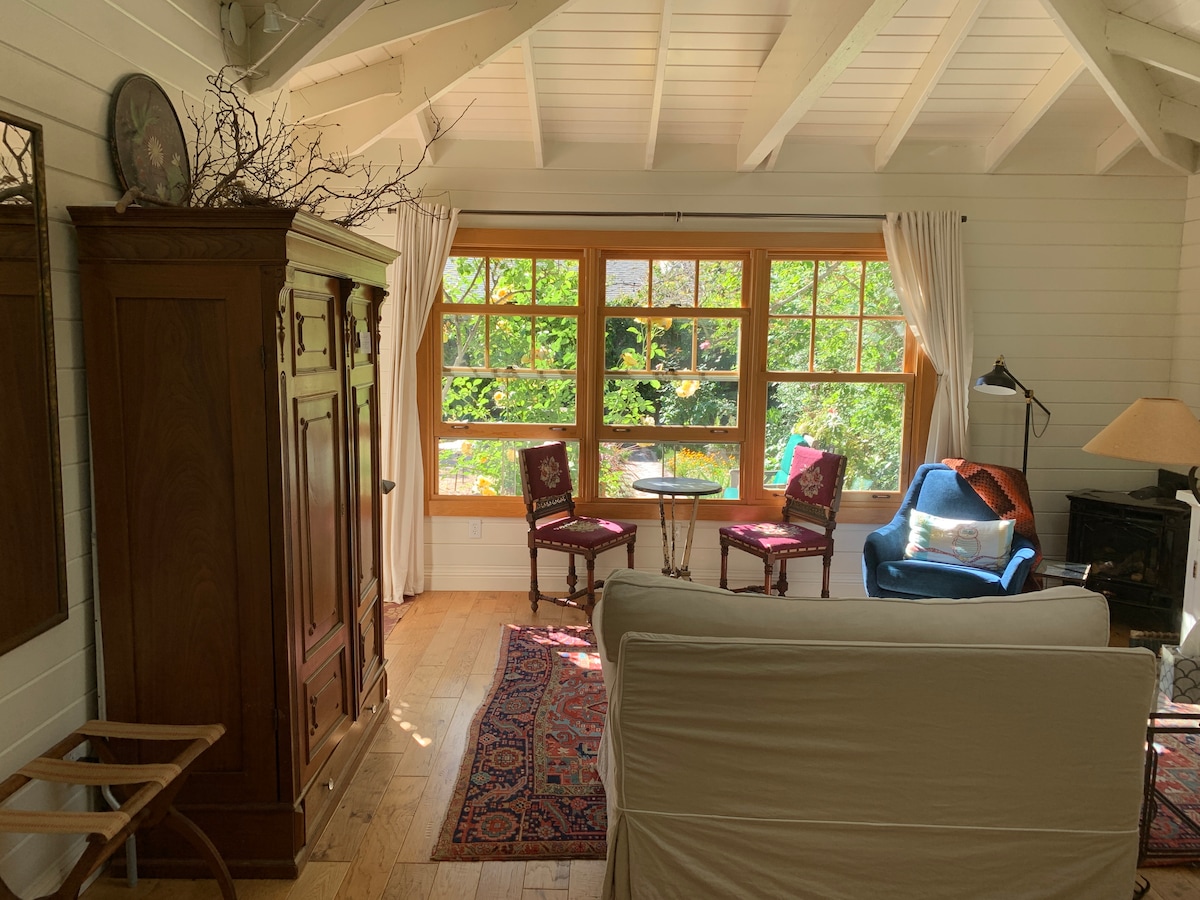 Splendido monolocale/chalet pieno di sole e arte, con angolo cottura e bagno, separato dalla casa principale. Situato in una bellissima versione californiana di un tradizionale giardino recintato in stile francese o inglese. Quartiere sicuro e accogliente. Goditi il canto degli uccelli nella tua oasi tranquilla e ricca di bellezza. Nel cortile di una grande casa, a volte disponibile. Nuovo materasso matrimoniale. Massimo 2 adulti. La terza persona è ammessa solo se si tratta di un bambino piccolo. Il monolocale è troppo piccolo per più persone. Non è presente una cucina completa.