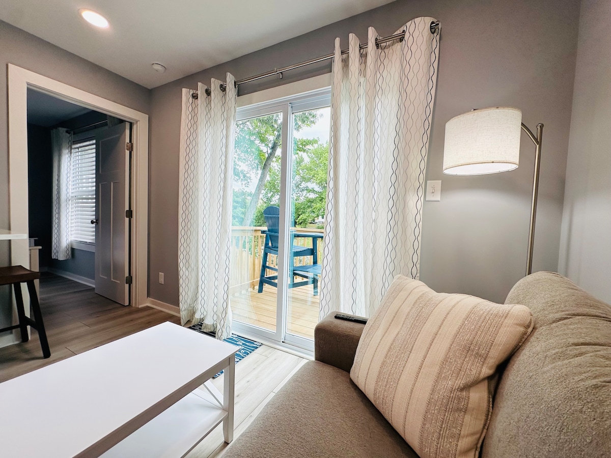 Appartamento con una camera da letto (suocera) di circa 35 metri quadrati, recentemente ristrutturato e super pulito. Tre isolati dalla spiaggia 7-10 minuti a piedi. Terrazza coperta, cortile sull'acqua per guardare anatre, aironi, pesci. Banchi di cemento e focolare vicino all'acqua. A pochi passi dall'oceano, dal lungomare, da Rudee Inlet, da ristoranti e luoghi di intrattenimento. Pavimenti in legno, letto queen size, "pack n play", angolo cottura con lavandino, frigorifero, forno a microonde, macchina per il caffè Keurig, tostapane (senza forno o piano cottura) 1 gig mbps Wifi, internet tv. Divano simile a un futon.
