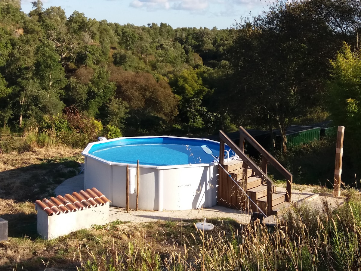 This amazing home-made house is newly renovated and located on our small farm where we grow vegetables and fruit trees. The house is made out of rammed earth and stones, placed just a few meters from the gorgeous river of Seixe, surrounded by green hills and fields. The valley is very calm and full of animals such as cows, horses, goats, donkeys, pigs & sheep. In the hot days you can take a cooling dip in the river or visit the amazing beach only 6 km away!