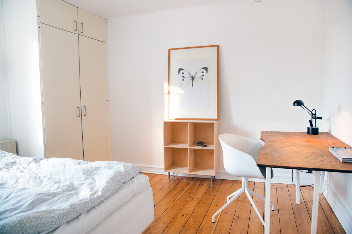 The guest apartment is located in one part of my house, which is located in quiet surroundings close to the city center. There is a separate entrance with a key box and exit to a south-facing terrace. I have chickens in the garden and will supply the apartment's fridge with eggs when there are any eggs. There is free coffee and tea, but you must bring your own milk and breakfast. I also live in the house, which is old and we all have to show consideration for each other of course.