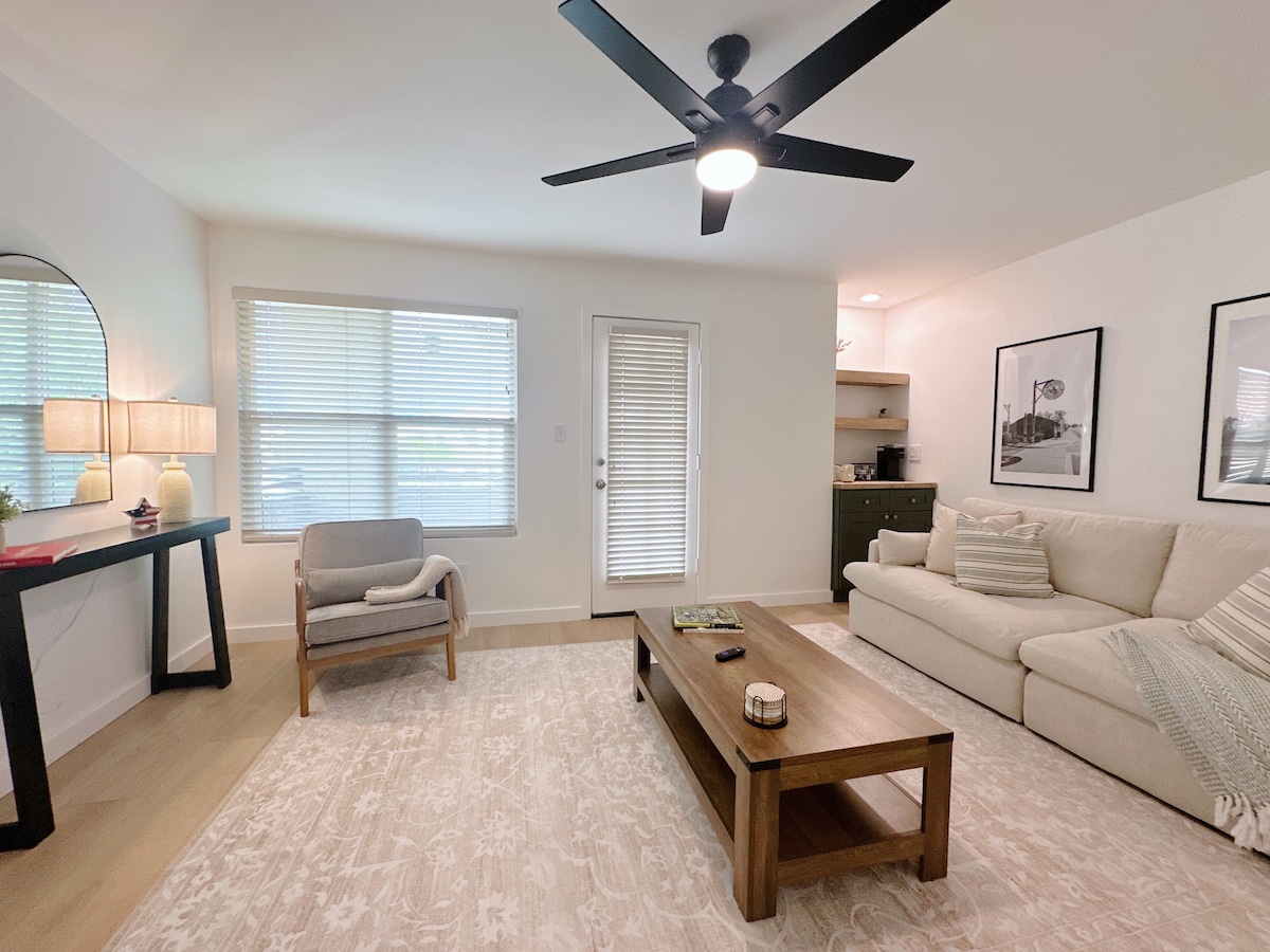 Lo spazio: Benvenuti a Palm Paradise, il vostro rifugio rilassante nel cuore della città vecchia di Scottsdale. Ristrutturato nell'ottobre 2024, questo appartamento unisce un elegante design desert-boho con tutti i comfort di una casa, creando uno spazio bello e funzionale. Rilassati sull'accogliente divano componibile in velluto a coste verdi, perfetto per un pisolino, o esci sul balcone privato per ammirare spettacolari viste sul tramonto sulla Camelback Mountain. Entra nella tranquilla camera da letto con letto king-size e lenzuola di alta qualità.