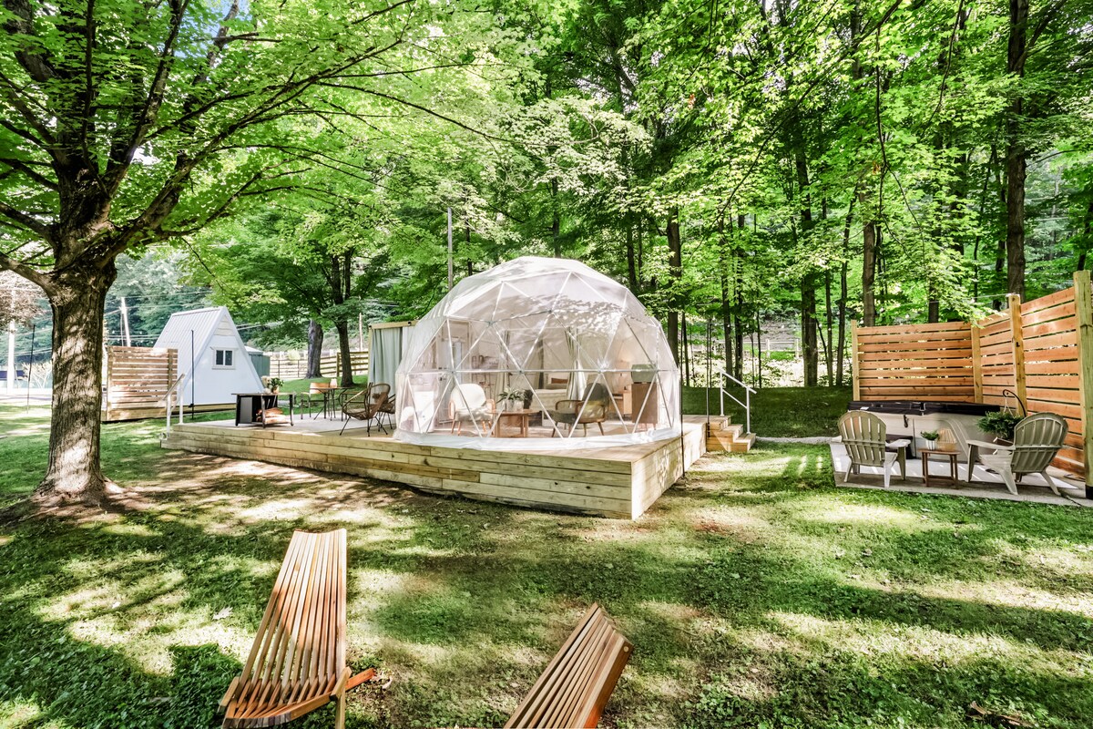 The Eclipse Glamping Dome is the perfect getaway to experience nature with all the luxurious amenities. - Open year-round—heat & AC - Located on 7 secluded acres - Direct access to the Mohican River - Private hot tub - Fully furnished patio with fire pit - Fully equipped kitchenette - Projector with Roku for streaming - CellularWIFI - Luxury bathroom - Scenic views of the forest and river - Paved parking area - 1.6 miles from the Bridge of Dreams/Mohican Valley Trail