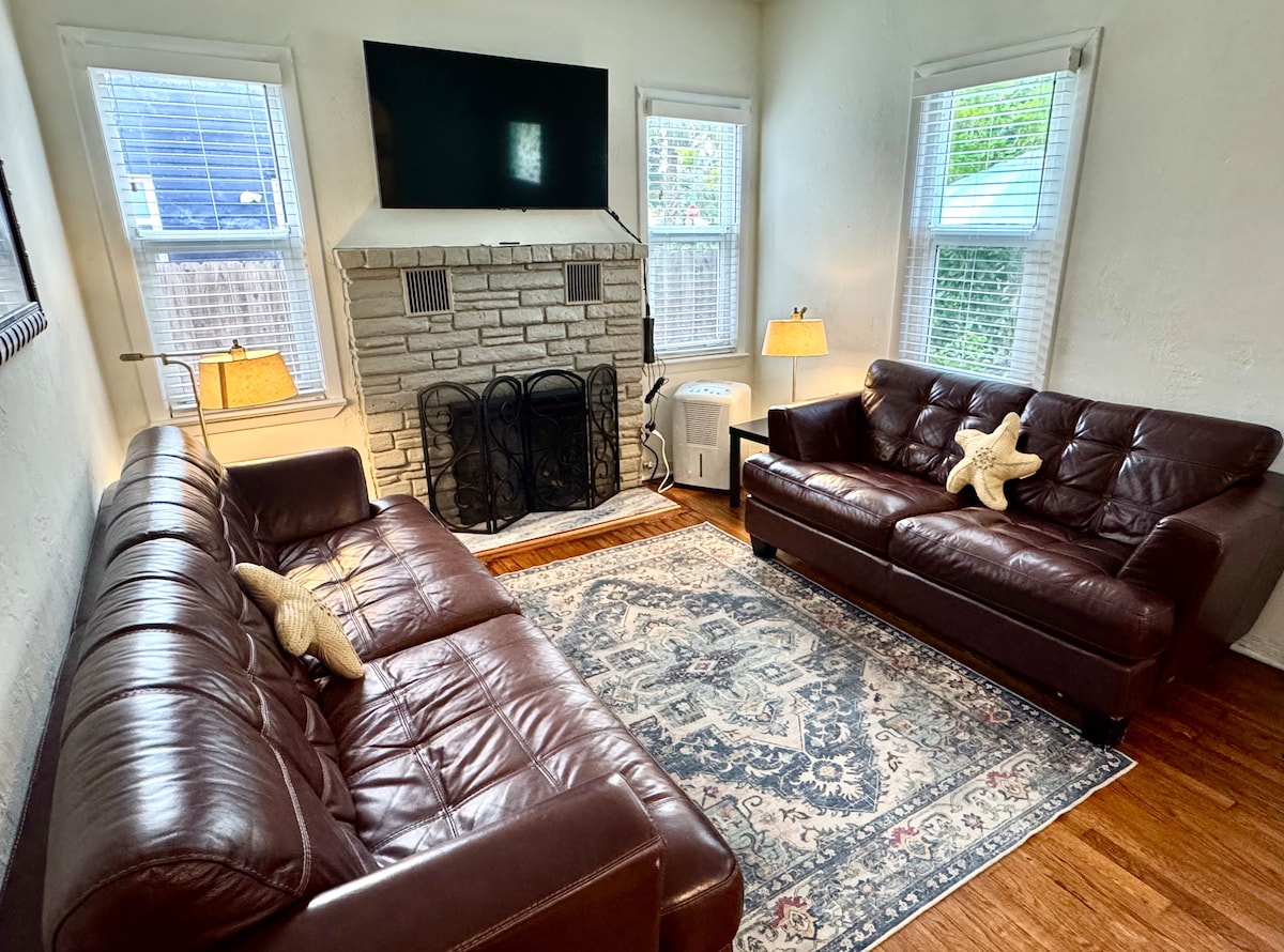 Charming historic 2 bed, 1 bath Key West-style home with original hardwood floors, an electric fireplace, and updated kitchen and bath fixtures. King bed in main bedroom, queen bed in second bedroom. Enjoy a spacious patio with relaxing hammock and charcoal BBQ grill. Includes WiFi, streaming TV, shared laundry, and 2 parking spots. Walk to Whole Foods, Maritime Academy, restaurants, and a park across the street. Just minutes to the beach, Las Olas, airport, cruise port, and vibrant nightlife.