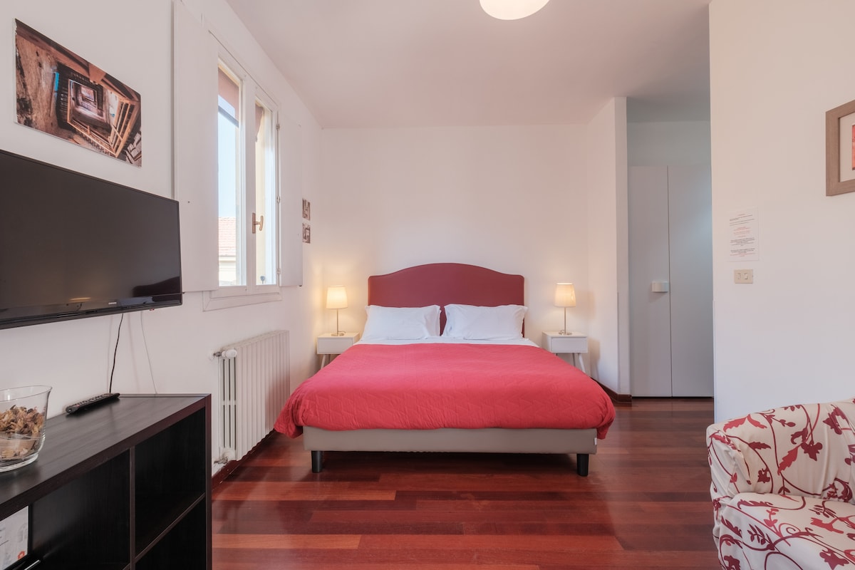 Open space di 60 mq nel centro storico di Bologna. Posto al primo piano di una storica palazzina situata di fronte alla Basilica di San Francesco, a 5 minuti a piedi da Piazza Maggiore. L'appartamento è arredato con gusto e dispone di tutti i confort per rendere piacevole il vostro soggiorno. L'open space dispone di una stanza studio con scrivania e di un piccolo balcone. Collegato ottimamente con i principali mezzi pubblici di trasporto e situato accanto a una stazione taxi.