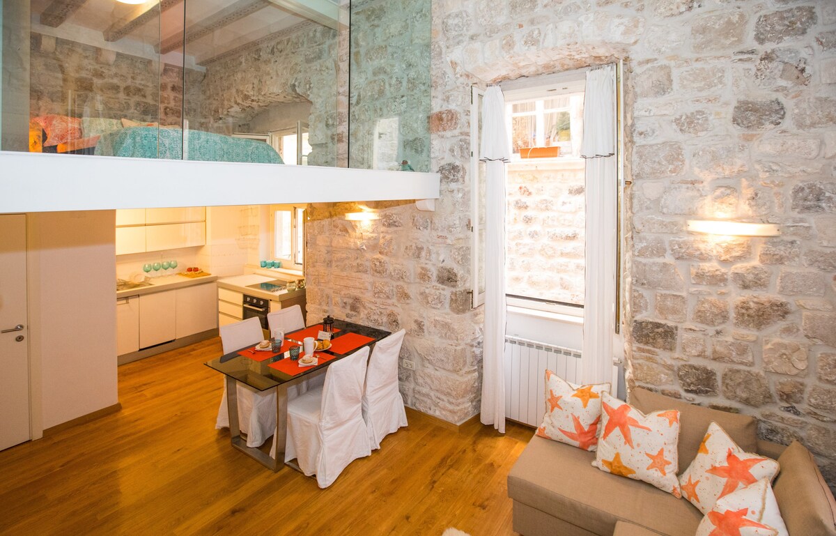Approfitta di questo privilegio e svegliati con questa surreale e incredibile vista "faccia a faccia" sulla parte storica della città, circondata dalle mura di Dubrovnik. Splendido rifugio di rinascita per due ospiti. Uno stimolante loft elegante, con un letto king-size e una personalità. In un edificio del 1700 sulla piazza principale, a un paio di metri dalla strada centrale della Città Vecchia, quindi tutto ciò di cui potresti aver bisogno è a cinque minuti a piedi.