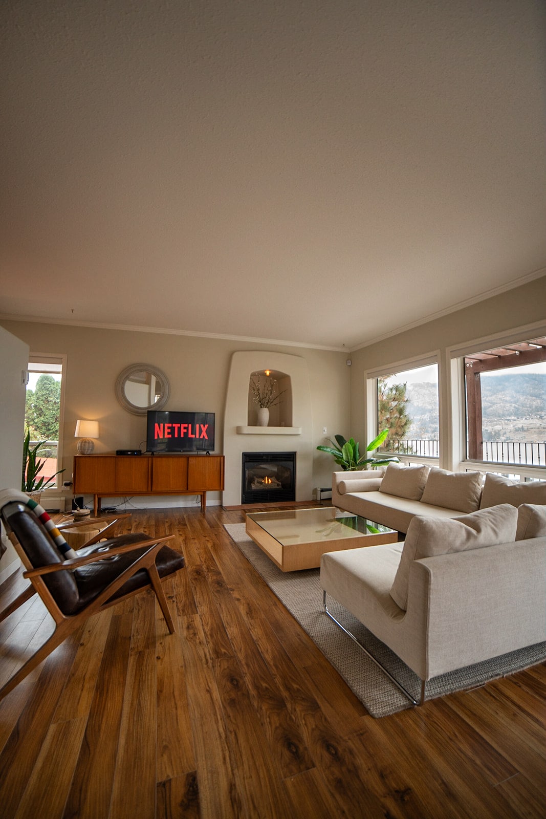 Stylish and centrally located, this beautiful second level suite is a short 15-minute walk to Okanagan Lake , a 10-minute walk to the South Okanagan Event Centre and the Convention Cente . A coded electronic drive-thru gate leads to your secluded courtyard and private entrance with loungers, picnic table, BBQ and evening lighting. The suite is bright and open, with a mixture of contemporary and mid century modern furniture, featuring paintings by local artists and all the comforts of home.