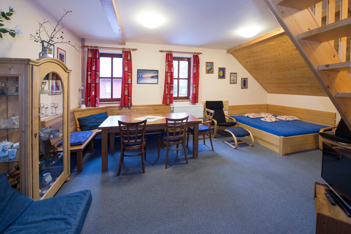 Offriamo l'affitto di un grazioso appartamento luminoso. Al piano terra dell'appartamento si trovano un disimpegno, bagno con wc, salone con angolo cottura, tavolo e letto matrimoniale e tv. Al piano superiore si trovano 2 camere da letto, una per 2 persone e l'altra per 3 persone. L'appartamento può ospitare 7 persone in totale. L'appartamento si trova in Skiland Area, che comprende ristoranti. Cucinano cibo ceco e internazionale tutto l'anno. Ideale per escursioni a piedi, in bicicletta e per sciare in inverno. La pista più vicina dista solo 500 mt.