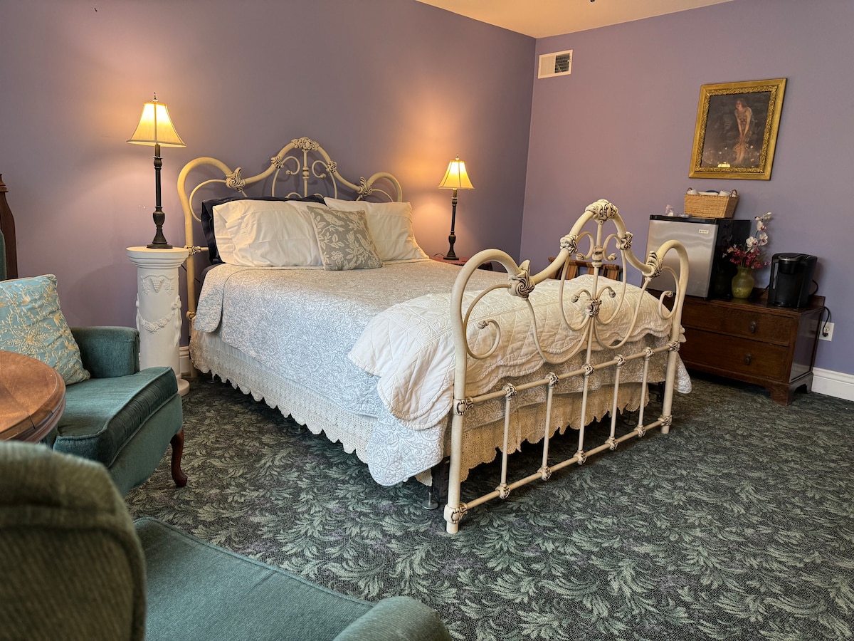 Welcome to The Wen Inn. The Walnut Suite (room 1) is the only suite within the Inn without stairs, located on the main floor. Offering a comfortable queen-size iron bed and features a large private ensuite bathroom with tub and shower combo. The suite has an adjoining parlor room with a gas fireplace, pump organ, and seating to relax and soak up the historic character. Furnished with authentic antiques and charming decor, the space is truly one-of-a-kind.