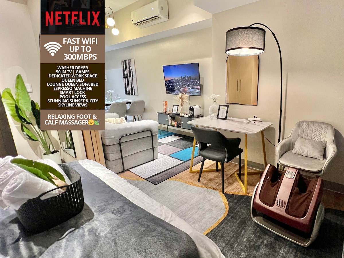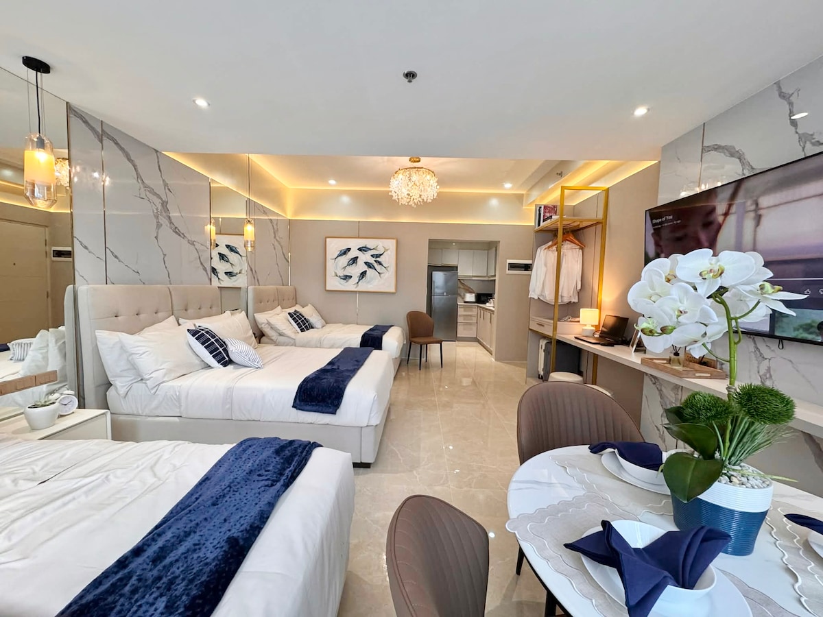 Questo luogo elegante e unico si ispira agli interni asiatici Crazy Rich. Situato nel cuore di Bonifacio Global City, questo nuovissimo spazio offre un'esperienza perfetta nel principale quartiere lifestyle-business del paese. - Self check-in senza chiave con smart lock - Smart TV con Max/HBO da 50 pollici 4k - Aria condizionata e luci intelligenti - Wifi molto veloce 250 Mbps - postazione di lavoro silenziosa Accesso per gli ospiti Piscina (solo dal martedì al venerdì) Niente palestra, ma palestra nel centro commerciale Parcheggio Campi da basket e badminton (prenotazione obbligatoria con almeno una settimana di anticipo)