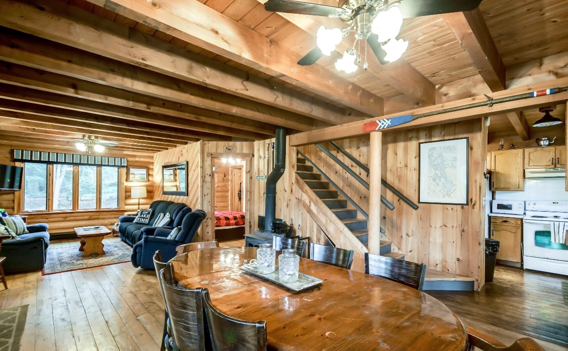 Booking Spring/Summer 2026+++ Boat access only! Aluminum Boat provided with rental. +++ Spacious 4 bedroom, 2 bath custom built log waterfront cottage! This property provides island privacy! In true Muskoka fashion experience a 2 min boat ride (boat provided) from the designated mainland parking lot to the large private dock located in front of the cottage. If need be we will happily meet you upon arrival. Bring your own boat and launch for free to access cottage and lake amenities.