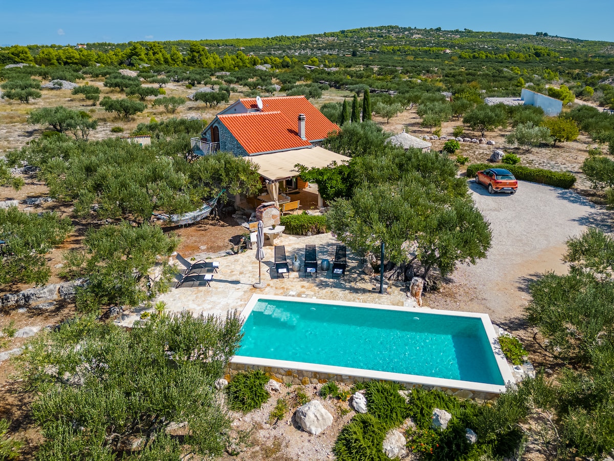 Una casa in pietra unica nel suo genere, in tipico stile antico dalmata, immersa in un uliveto tentacolare, offre la massima privacy. Questo luogo magico, avvolto dal profumo di lavanda e con una splendida vista sul mare, offre pace e relax indescrivibili lontano dalla frenesia della vita. Goditi la piscina privata riscaldata e le passeggiate lungo la riva del mare. Il mare dista 120 metri, il centro di Mirca circa 1 km, Sutivan circa 2 km e il capoluogo dell'isola, Supetar, con il suo porto, 3 km.
