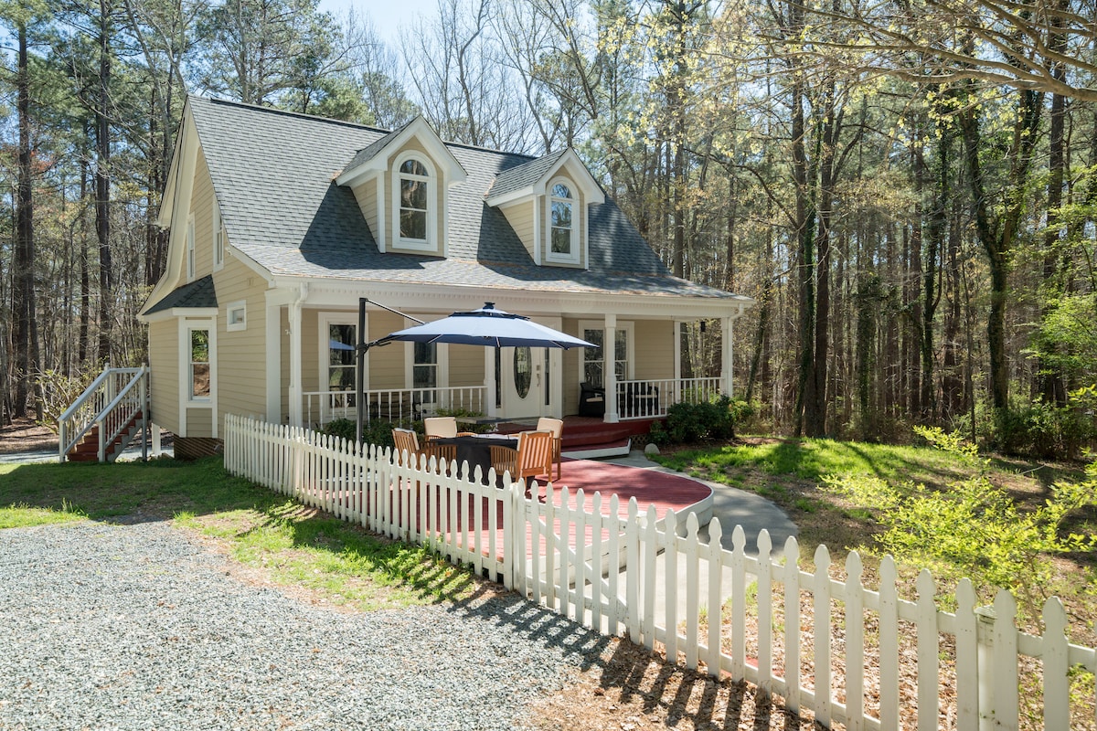 Presentato in un numero di Southern Living Magazine, questo è uno spazio accogliente, pieno di libri, recentemente ristrutturato con arredi eleganti e un portico avvolgente, situato in una bellissima foresta piemontese ricca di fauna selvatica. Ci sono sentieri escursionistici lungo New Hope Creek e altri nelle vicinanze. Molto privato e tranquillo, ma a soli 8 minuti dall'ospedale UNC, dal campus di Hillsborough, a 20 minuti da Duke, UNC-CH, NCCU e dalla storica Hillsborough —Aeroporto RDU a soli 30 minuti. Sono benvenuti ospiti di tutte le estrazioni sociali.