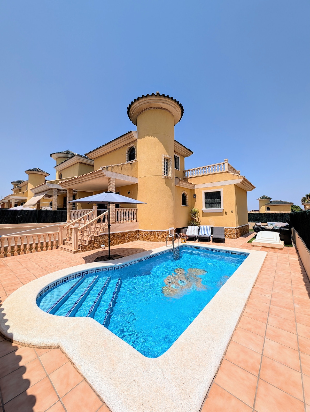 Golf, spiaggia, bar, ristoranti, grande città o relax tranquillo. Porta la tua famiglia o i tuoi amici e goditi questo elegante alloggio. La nuovissima villa di lusso offre una vasta gamma di servizi. Giardino privato e zona piscina con varie aree salotto, lettini e barbecue, perfetti per rilassarsi all'aperto. Puoi divertirti su tre piani con una grande terrazza sul tetto dove puoi goderti la vista della città e verso il mare. Aria condizionata e internet veloce. Offriamo 3 letti matrimoniali 160*200 e 4 letti singoli 90*200.