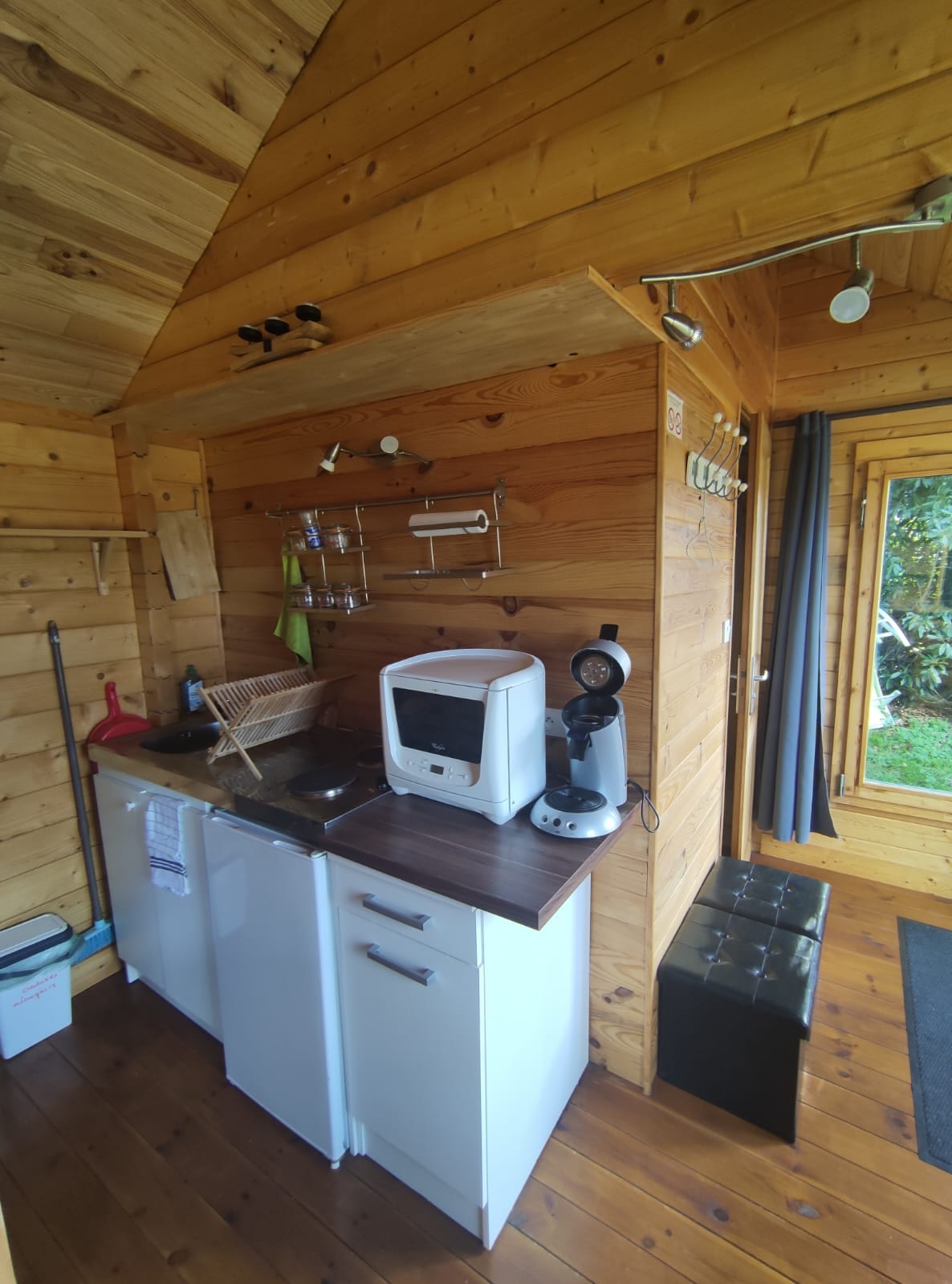 L'alloggio è composto da due parti separate da 5 metri l'una dall'altra; uno chalet con camera da letto privata di 16mq dotato di un letto matrimoniale e un letto singolo rialzato da un lato e un edificio di 17mq adiacente alla nostra casa in cui ci sono un bagno e un angolo cottura/zona pranzo privata. Il tutto costituisce un alloggio completo indipendente.
