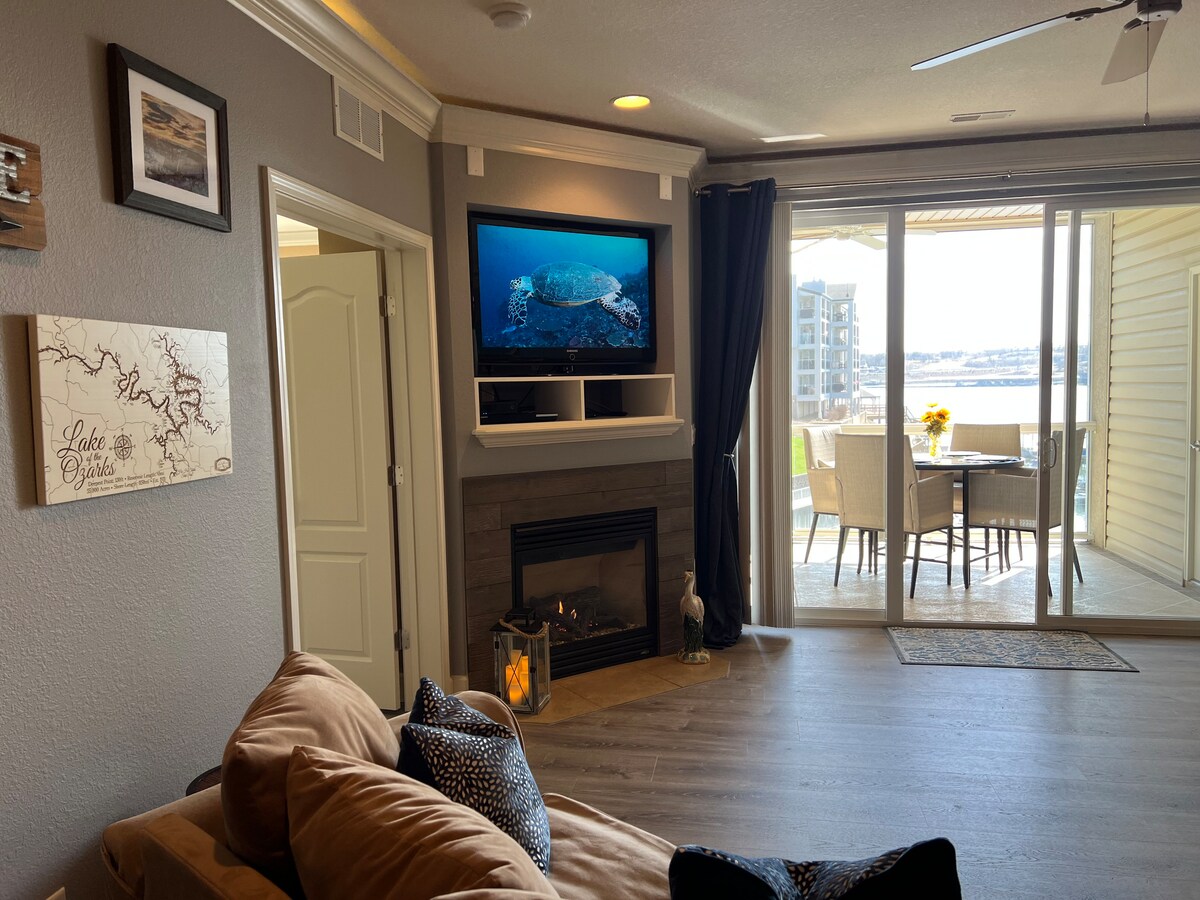 Splendido appartamento con una camera da letto con letto king-size situato a Osage Beach. Viste mozzafiato! Coperta, schermata in terrazza con vista sul lago. Bagno SPA ristrutturato con marmo italiano. Pavimenti in legno massello ovunque. Posizione nella baia/indicatore 21 miglia. I servizi includono un posto barca in affitto, la pesca, un camino e una piscina! Molti ristoranti raffinati, ottimi negozi e attività divertenti via terra/acqua. Goditi tutto l'anno con il riscaldatore da patio e il camino elettrico! Disponibile anche per affitti a breve/lungo termine