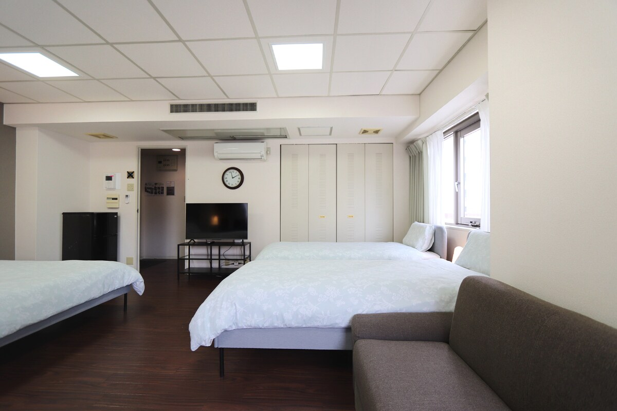 ◆Zona popolare, alla moda, tranquilla e sicura! Camera spaziosa, pulita e confortevole con 2 letti matrimoniali e 2 divani letto. Goditi una rilassante passeggiata nel quartiere con molti caffè alla moda e negozi specializzati. A soli 7 minuti a piedi da Shinsaibashi e a 3 minuti a piedi da supermercati/farmacie/minimarket aperti 24 ore su 24. Facile accesso con 5 minuti a piedi da Sakaisuji Honmachi St e 6 minuti a piedi da Nagahoribashi St, che dispone di scale mobili per un comodo trasporto anche con bagagli pesanti.