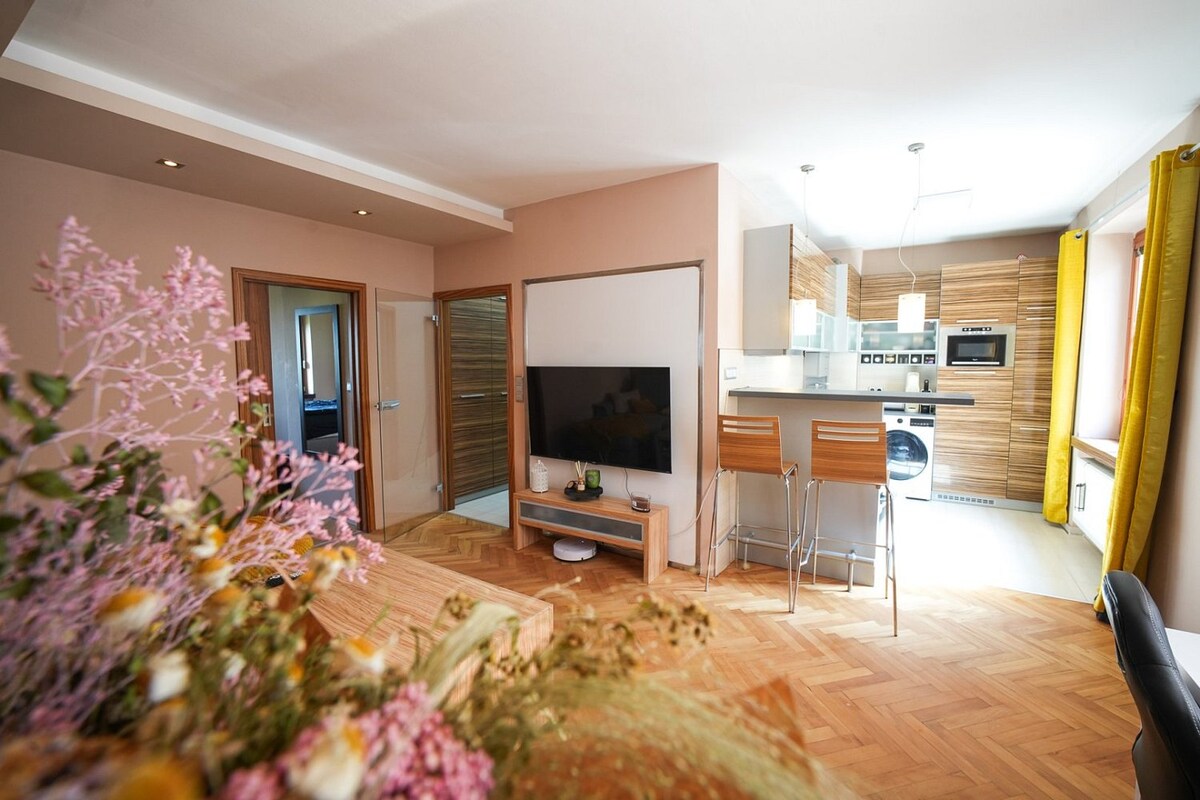 L'appartamento si trova al 7° piano di un edificio con una splendida vista da tutte le finestre, il che rende l'appartamento incredibilmente luminoso, soleggiato e silenzioso. Potete rilassarvi sulla terrazza su un comodo divano o in camera da letto in un letto. Le calde giornate estive saranno rese più piacevoli dall'aria condizionata. Una cucina completamente attrezzata e una macchina da caffè Nespresso sono una cosa ovvia. In soli 10 minuti a piedi si arriva al centro di Brno. Gli amanti della gastronomia, dei monumenti, dei parchi, dello sport e dei caffè alla moda, che sono numerosi nelle vicinanze, troveranno pane per i loro denti.
