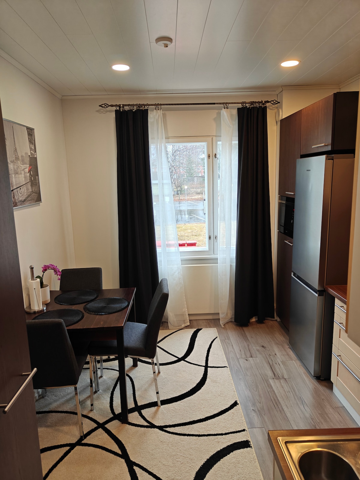 Monolocale al termine di una casa indipendente al secondo piano. C'è una serratura a codice sulla porta. La struttura è situata sul lato nord di Oulu, lungo l'autostrada vicino all'Oulu Ideapark. L'appartamento dispone di un letto matrimoniale e di un divano letto Karup design (misura 140x200). La cucina è ben attrezzata, con piano cottura a induzione, lavastoviglie integrata, frigorifero e congelatore. Caffè, bollitore e forno a microonde si trovano nella credenza della colazione. Lavatrice nel bagno. Animali domestici a pagamento. Parcheggio gratuito.