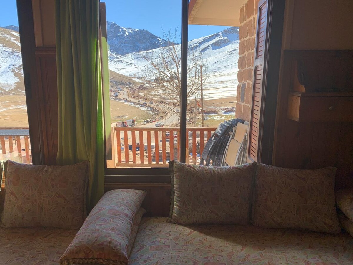 Oukaïmeden è la principale stazione sciistica del Marocco e la più alta stazione sciistica dell'Africa. Questo bellissimo appartamento familiare ristrutturato è composto da 1 camera da letto, 1 cucina, 1 bagno in tadelakt, un ampio soggiorno con camino e una superba terrazza con vista mozzafiato sulle piste da sci e toubkal. Gli amanti dell'astronomia possono godere dei più bei siti di osservazione al mondo perché lo chalet si trova tra le piste e l'osservatorio.