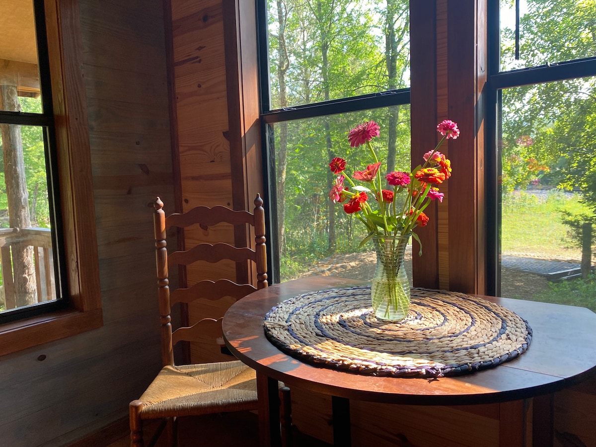 Chalet privato a energia solare "Top of the Buffalo" nelle sorgenti del fiume Buffalo, circondato dalla foresta nazionale di Ozark, nel cuore dei sentieri per mountain bike dell'Upper Buffalo. Vicino a Hawksbill Crag/Whitaker Point, Upper Buffalo Wilderness, Horseshoe Canyon, Glory Hole, Lost Valley, Hailstone e Kings River Falls. Campeggio di lusso senza tenda. Utilizza una dependance e una doccia solare all'aperto. Pulizia di base. Lettini in legno. Niente letti, lenzuola, coperte o cuscini. Il valore sta nell'isolamento e nella posizione