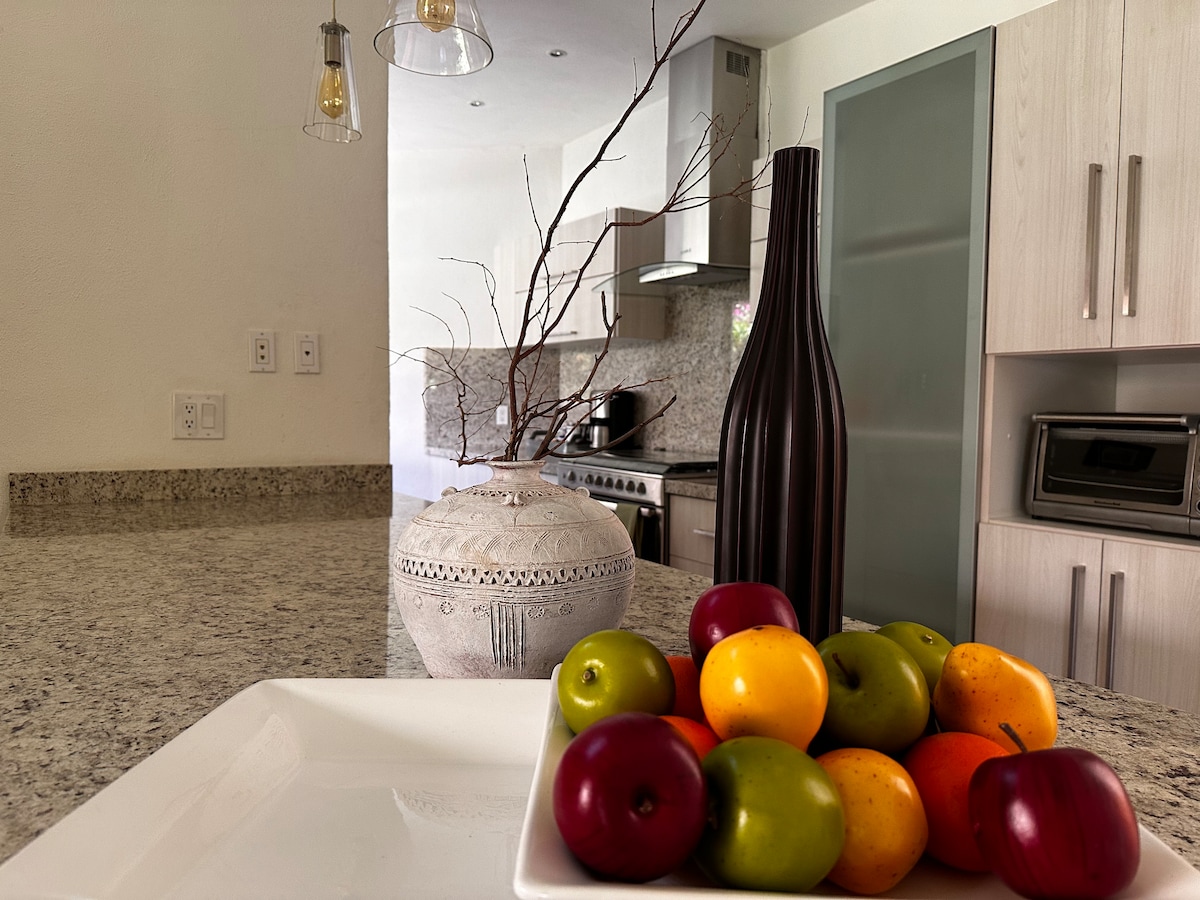 Un departamento residencial con mucho estilo ideal para disfrutar con tu familia, dentro de un exclusivo residencial con alberca. ••SI FACTURAMOS•• Cuenta con áreas comunes como alberca,dog park, ajedrez gigante, canchas de fut bol, juegos infantiles, etc. IMPORTANTE: Para el uso de alberca se debe solicitar las pulseras antes del inicio de la reservación. NO ofrecemos el servicio de aire acondicionado, lavadora o secadora.