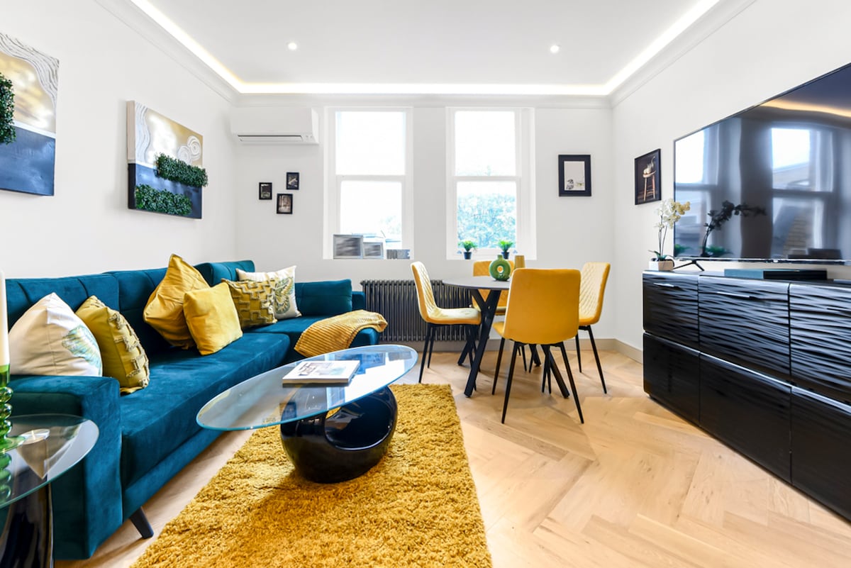 Home to trendy eateries, vintage shops, and pretty pastel-coloured houses, there's a reason Notting Hill is one of London's most beloved neighbourhoods. This cosy apartment is in the heart of the action, just a short walk from Kensington Palace, Hyde Park, and the lively Portobello Road. The interior is all about the sleek finishes, with botanical prints and greenery adding a bohemian touch. Plus you'll benefit from a private patio for a chilled coffee break.