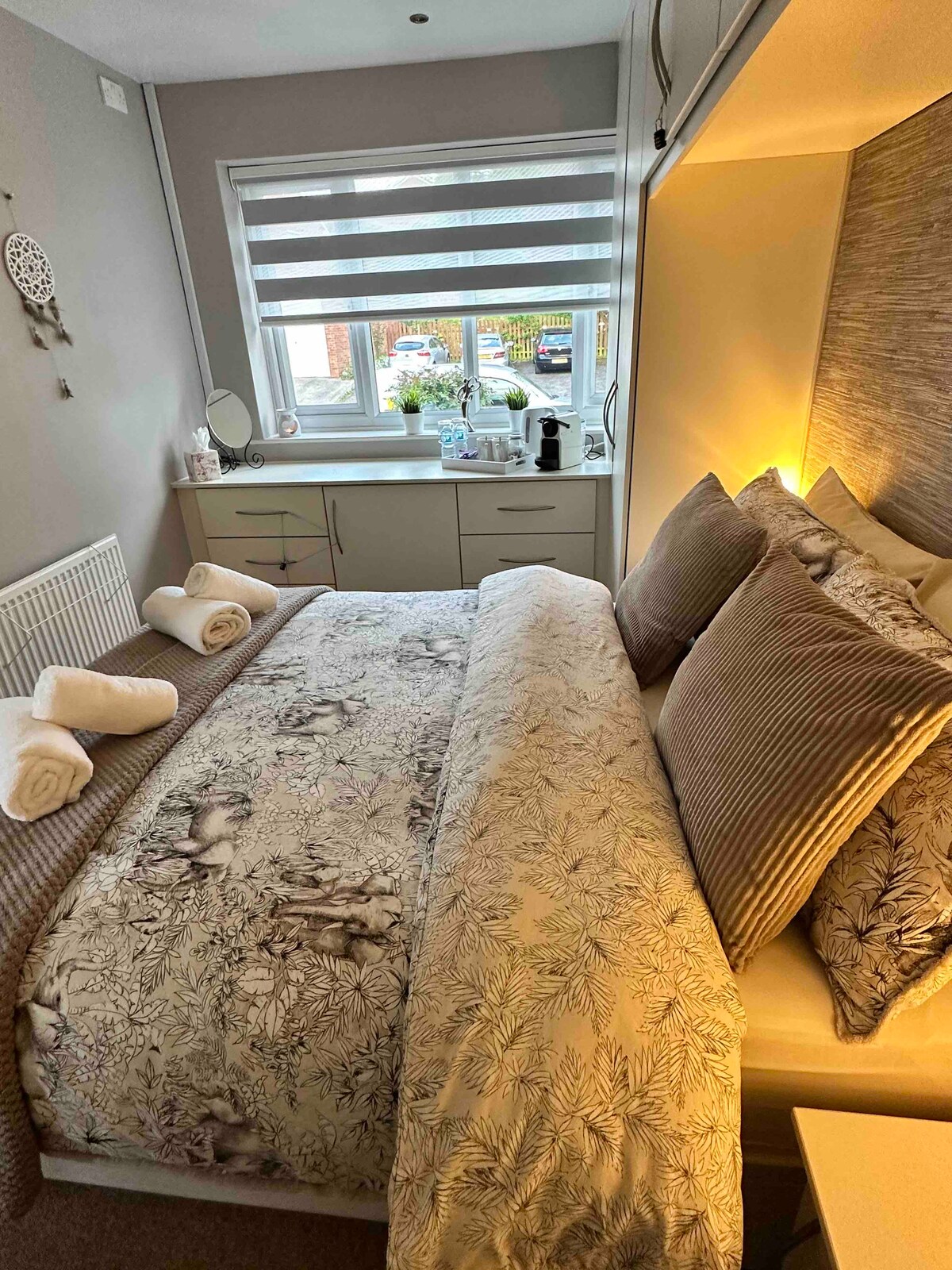 Dependance indipendente nel mio giardino privato con bagno interno. Ingresso indipendente tramite cancello laterale. Frigorifero e bollitore con tè e caffè, forno a microonde, tostapane, stoviglie, posate e bicchieri. Vengono forniti cereali e latte per la colazione, e gli ospiti possono portare con sé cibo e bevande. Palestra e piscina dall'altra parte della strada, pub e takeaway raggiungibili a piedi. Include asciugamani e articoli da toeletta. Le serate domenicali sono disponibili su richiesta.