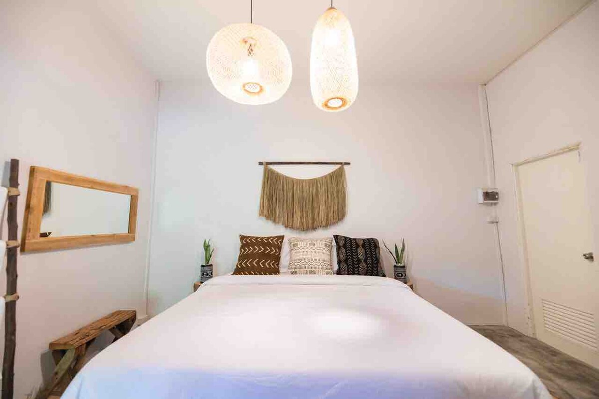 Tranquilla e privata casa colonica a due piani in affitto. È un monolocale al piano superiore con cucina, patio, condizionatore, bagno(acqua calda/fredda) e c'è una piccola palestra al piano terra. La pensione è indipendente e si trova nella mia piccola azienda agricola di frutta nel distretto di Thamai, a 4 km dalla città di Thamai, a 15 km dalla città di Chanthaburi e a 15 km dalla spiaggia di Chaolao. Soggiornerai in una fattoria locale in un piccolo villaggio. Niente colazione. Proprietario amichevole come guida e amico thailandese. Animali domestici ammessi (200 baht per animale)