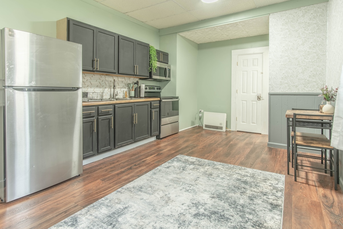 Di gran lunga superiore alle camere d'hotel della zona, questo appartamento di lusso con 1 camera da letto è dotato di WiFi gratuito, TV Roku TV da 50" e 32" (usa le tue app preferite), TV via cavo tramite app Spectrum, lettore DVD/CD/Blue Ray, bidet, lavatrice e asciugatrice, vasca idromassaggio, cucina attrezzata. Camera da letto con il miglior letto king size di sempre, guardaroba/armadio, cassettiera, comodini, bagno e soggiorno con divano letto queen size facile da usare. Gas, elettricità, acqua, rimozione neve, parcheggio, pavimenti in legno massello, cucina/bagno piastrellati. ENORMI SCONTI PER SOGGIORNI PIÙ LUNGHI!