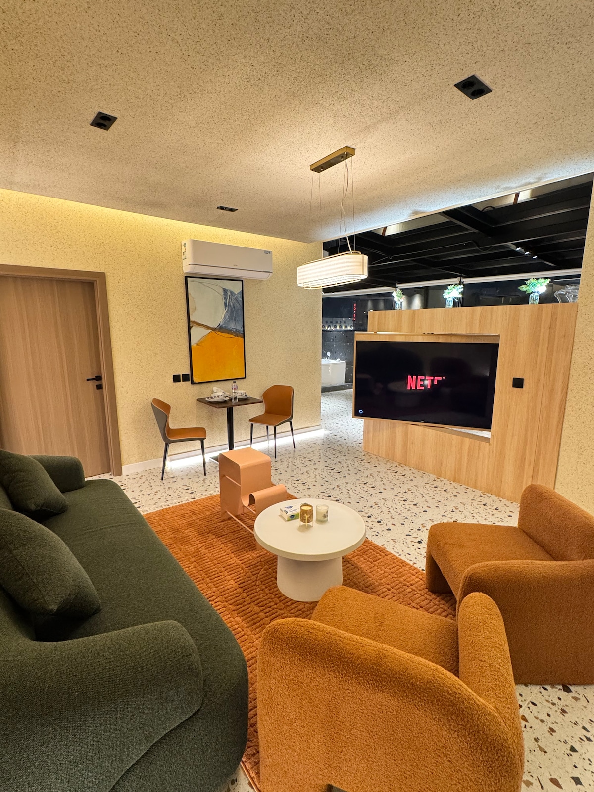 Attico di lusso con ingresso indipendente composto da due camere da letto, un soggiorno, una sala cinema, un'area salotto all'aperto e due bagni completamente attrezzati con shampoo, pantofole, asciugamani e salviette. • Situato nel complesso residenziale Rasf – Distretto di Qurtubah La TV del soggiorno e il proiettore home cinema permettono di accedere a tutte le principali piattaforme. (Netflix, YouTube e altro ancora). L'immobile si trova in una posizione strategica, vicino a: • Roshn Front (Riyadh Front) – 6 minuti • Aeroporto internazionale Re Khalid – 15 minuti