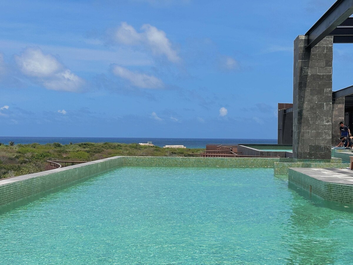 Welcome to The Sanctuary Tulum @ Amira District. Escape to this 1bd 1 bath apartment featuring a cozy living room and a private plunge pool with jets (both cold & warm water!) Enjoy ocean views and beautiful sunsets from the rooftop pool. Easy access to the public beach, private beach clubs and nearby attractions like Jaguar Park, Project Papaya, Ciel Rose-- all just a 10-18 minute walk away. Designed with love and intention, The Sanctuary invites you to stay with us & retreat from daily life.