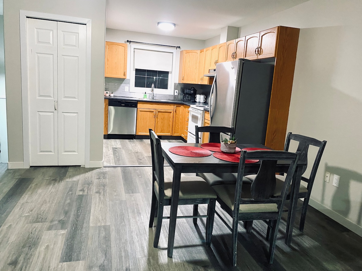 Take it easy at this unique and tranquil getaway. In a quiet neighborhood. Your own home away from home. With private deck and parking, close to all amenities: upgrader, ball diamonds, shopping, etc., this will fit perfect into your stay plans. Your private home boasts a king size bed, WIC, 3-piece bathroom, updated kitchen, living room with wifi for your electronics, and a laundry room. Private deck and BBQ complete the package. On same property as host.