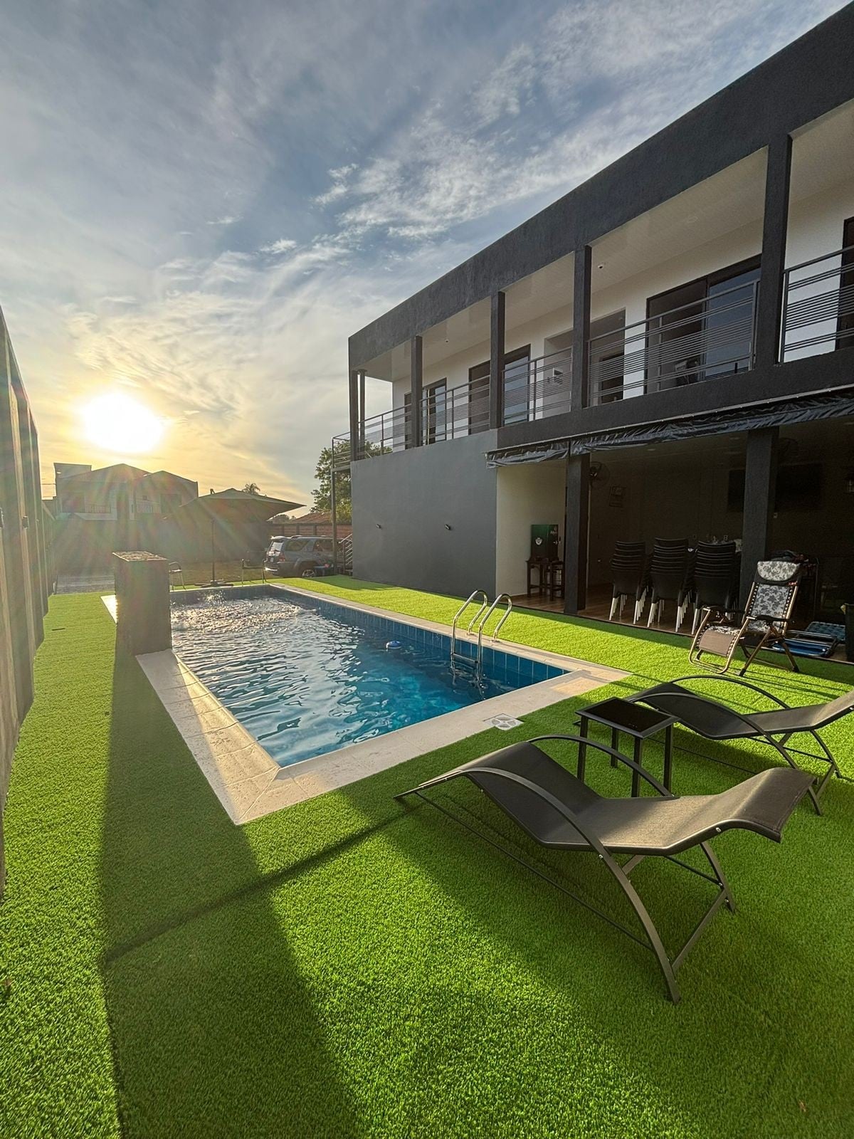 Casa con amplio patio y pequeña piscina, a 4 cuadras de la Av. Guillermo Nauman, amplio quincho y abudante vegetación. Cuenta con generador, bomba, tanque de agua, verde cesped. Todas las habitaciones con AA.