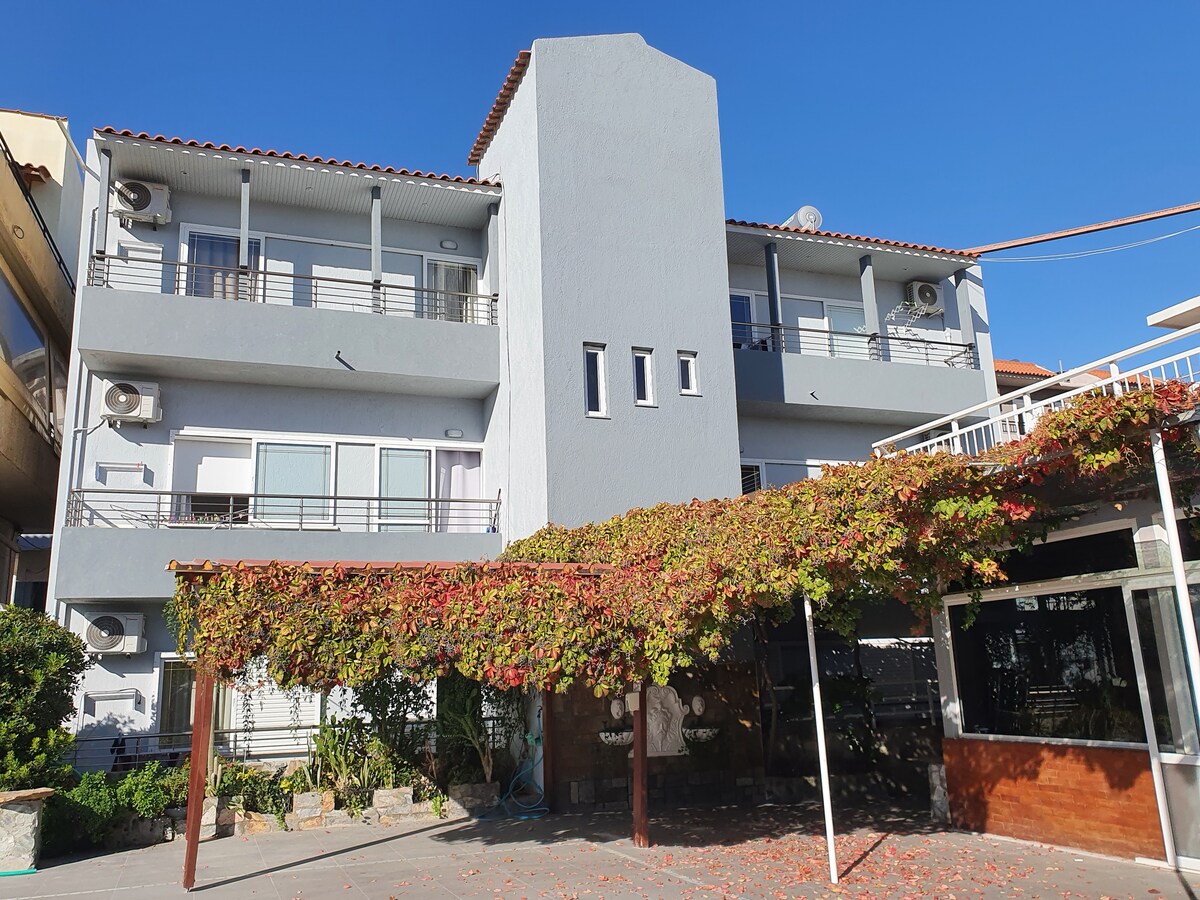 A pochi passi dalla spiaggia, questo incantevole appartamento al piano terra offre vista sul mare, due balconi, una camera da letto accogliente e una luminosa zona soggiorno e cucina a pianta aperta. Completamente attrezzato con WiFi, aria condizionata, Netflix, giochi e tutto il necessario per una vacanza cretese perfetta. Adatto alle famiglie, facile accesso a ristoranti, bar, supermercati e alla fermata dell'autobus. Porta il tuo sorriso, al resto pensiamo noi!